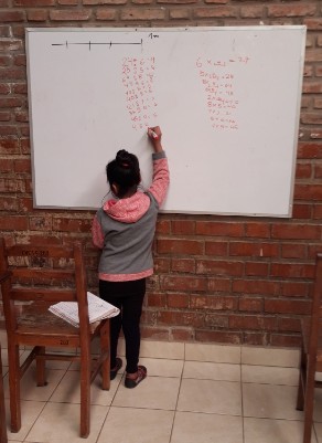 Ein kleines Mädchen, Dahyani eine Überfliegerin, stelle ich einfach an die Tafel (auf einen Stuhl, sie ist noch sehr klein) und lasse sie Aufgaben rechnen, die ich ihr in Matrix-Form hingeschrieben habe. Sie ist sehr zufrieden da und sagt immer nur „El siguiente.“ Die nächste Aufgabe bitte. Und strahlt.